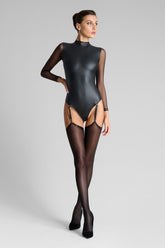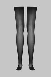 Charakteristische Strümpfe mit gerolltem Abschluss von Maison Close. Die schwarze Farbe betont elegant die Beine und verleiht einen einzigartigen Stil. Seidige, halbtransparente Strümpfe mit 40 Denier, ideal zu einem Strapsgürtel für perfekten Halt.