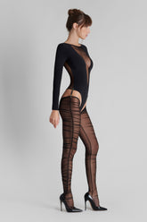 Asymmetrische Strümpfe aus transparentem Tüll. Eine äußere Plissee-Naht verläuft von der Fußspitze bis zum oberen Ende der Hüfte. Ein schräges Cut-out-Detail enthüllt einen sinnlichen, herzförmigen Po-Ausschnitt. Am Beinausschnitt befinden sich zwei abnehmbare Strumpfhalter mit goldfarbenen Accessoires, die sich nach Belieben an Ihren Dessous befestigen lassen.