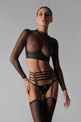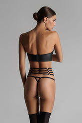 Strapsgürtel Parure Signature von Maison Close. Die feinen, goldenen Ringe und die elastischen Strapsbänder schmücken gekonnt die Nacktheit. Vier verstellbare und abnehmbare Strumpfhalter greifen nach Strümpfen, um dem Gesamtbild den letzten Schliff zu verleihen, und ermöglichen es, den Straps in einen Gürtel zu verwandeln. Verstellbar und komplett anpassbar.