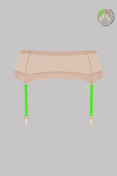 Der Strumpfhaltergürtel in der Farbe Nude besteht aus einem weichen Tüll mit schillernder Transparenz. Häkchenverschluss im Rücken.
