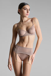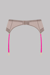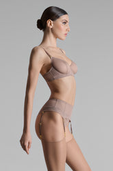 Der Strumpfhaltergürtel in der Farbe Nude besteht aus einem weichen Tüll mit schillernder Transparenz. Häkchenverschluss im Rücken.
