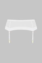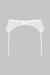 Der Strumpfhaltergürtel in der Farbe Weiß besteht aus einem weichen Tüll mit schillernder Transparenz. Häkchenverschluss im Rücken.
