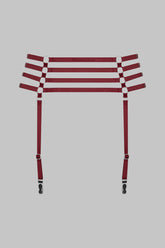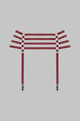 Strapsgürtel von Maison Close. Die feinen, silbernen Ringe und die elastischen Strapsbänder in Bordeauxrot schmücken gekonnt die Nacktheit. Vier verstellbare und abnehmbare Strumpfhalter greifen nach Strümpfen, um dem Gesamtbild den letzten Schliff zu verleihen, und ermöglichen es, den Straps in einen Gürtel zu verwandeln. Verstellbar und komplett anpassbar.