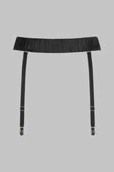 Strumpfhaltergürtel aus Naturseide. Elastischer Gürtel mit Seidenbezug, der gerafft und mit einer goldenen Schnalle verziert ist. Goldfarbener Verschluss, der je nach Vorliebe vorne oder hinten wie ein Schmuckstück angebracht werden kann. Vier verstellbare und abnehmbare elastische Strumpfhalter mit goldfarbenen Details. Die zwei kürzeren Strumpfhalter werden vorne angebracht, die zwei längeren Strumpfhalter werden hinten platziert.