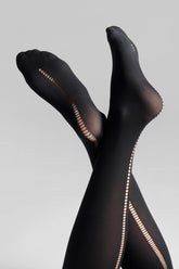 Die blickdichten Strumpfhosen der Linie Ligne Infinie betonen die Silhouette mit ihrem formenden 60-Denier-Gewebe. Die durchbrochenen Linien, die wahlweise vorne oder hinten getragen werden können, setzen die Beine elegant in Szene. Ein hoher, flacher Bund unterstreicht die Taille.