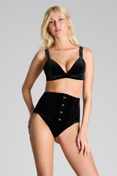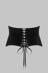 Gesteppter Samt betont die Hüften und unterstreicht die Linien des Körpers. An der Vorderseite schließt eine Metallplatte mit goldfarbenen Haken das Taillenkorsett wie ein traditionelles Korsetterie-Stück. Am Rücken ermöglicht eine verstellbare Schnürung mit goldfarbenen Ösen und Schmuckenden, die Weite nach Wunsch zu regulieren.