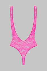 Der String-Body in Neonfarbe ist mit durchbrochener, überwiegend recycelter Spitze gefertigt. Breite Träger enthüllen einen tiefen Rückenausschnitt, eingefasst mit einem flachen Gummiband. Enganliegender Schnitt, ebenfalls mit einem flachen Gummiband eingefasst. Sein Dekolleté, die ausgeschnittenen Armausschnitte und der atemberaubende Rückenausschnitt versetzen uns zurück in die 80er-Jahre.