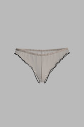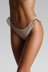 Tanga aus transparentem, leichter und luftiger Mousseline‑Gewebe. Der elastische Bund begleitet den Körper mit sanfter Beweglichkeit. Der französisch hoch geschnittene Schnitt ist mit zarten Volants an den Hüften abgeschlossen, die eine retro‑inspirierte 80er‑Note verleihen.