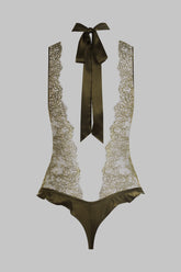Triangel-String-Body aus Seide und Wimpernspitze. Hoher Beinausschnitt, verziert mit Seidenrüschen, die dezent die Hüften und den Po zeigen. Transparente Spitze, die subtil die Brust enthüllt und einen Rücken präsentiert, der bereit ist, ausgezogen zu werden. Stehkragen aus Seide, der in ein breites Band übergeht, das je nach Geschmack im Nacken gebunden werden kann. Lässt sich im Schritt nicht öffnen, um den Tragekomfort zu erhöhen.