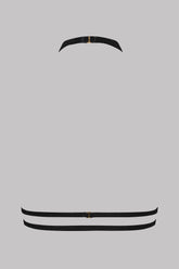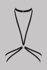 Das SAMTSET Harness betont die Linien des Oberkörpers mit Präzision. Gefertigt aus samtig weichem Material, besteht es aus verstellbaren Bändern, die sich flexibel an die Silhouette schmiegen. Ein goldener Anhänger mit der Gravur *Maison Close* zeichnet dieses Stück aus. Entworfen, um allein oder mit dem passenden Ouvert-Slip getragen zu werden, erzeugt es die Illusion eines Bodys. Ein wandelbares Lingerie-Accessoire, geliefert im schwarzen Samtbeutel.
