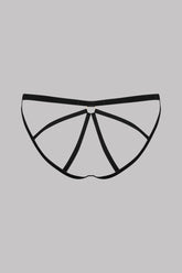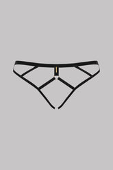 Der Ouvert-Slip SAMTSET spielt mit Schlichtheit und Andeutung. Gefertigt aus weich anmutendem Samt, zeigt er eine offen gearbeitete, geometrisch strukturierte Form, verziert mit einem goldenen Anhänger mit der Gravur Maison Close. Entworfen, um allein oder mit dem passenden Harness getragen zu werden, erzeugt er die Illusion eines Bodys. Er schmiegt sich präzise und dezent an die Silhouette. Ein raffinierter, minimalistischer und grafischer Slip mit Täuschungseffekt.