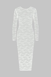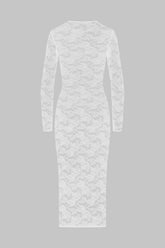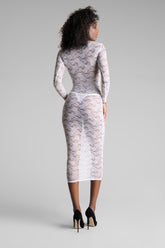 Das lange Kleid langen Ärmeln ist mit Lochspitze verziert, die größtenteils aus recyceltem Material gefertigt wird. Eng anliegender Schnitt und flaches Gummiband. Midi-Länge, die die Kurven betont, für einen selbstbewussten 80er-Jahre-Stil.
