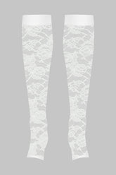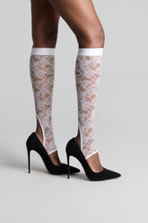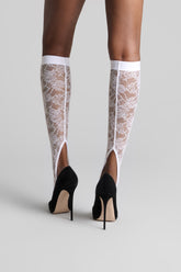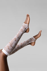 Die Gamaschen sind mit Lochspitze verziert, die größtenteils aus recyceltem Material gefertigt wird. Eng anliegender Schnitt und flaches Gummiband. Ausgeschnittene Öffnung auf der Rückseite des Beins. Offene Fußspitzen.