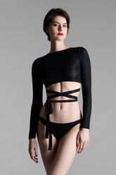 Langärmelige Wickelbluse mit einzigartigem Tragegefühl. Dehnbares, ultraweiches und leichtes Ripp-Modal, das sich sowohl in der Version Glanz als auch in der Version Transparenz dehnt. Wendbarer, überkreuzter Herzausschnitt, der vorne oder hinten getragen werden kann. Spielen Sie mit der Schnürung, um die Wickelbluse zu schließen und nach Lust und Laune zu variieren.