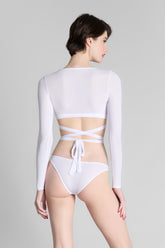 Langärmelige Wickelbluse mit einzigartigem Tragegefühl. Dehnbares, ultraweiches und leichtes Ripp-Modal, das sich sowohl in der Version Glanz als auch in der Version Transparenz dehnt. Wendbarer, überkreuzter Herzausschnitt, der vorne oder hinten getragen werden kann. Spielen Sie mit der Schnürung, um die Wickelbluse zu schließen und nach Lust und Laune zu variieren.